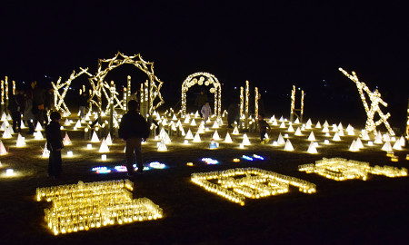 東日本大震災の発生から15年となった岩手、宮城、福島各県の沿岸部では11日夜、犠牲者を追悼する灯篭やランタンの明かりが辺りを温かく照らした。写真は福島県富岡町。 【時事通信社】
