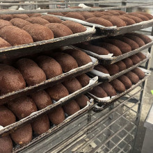 「福田製パン」直売所に並ぶ「きなこあげパン」「ココアあげパン」