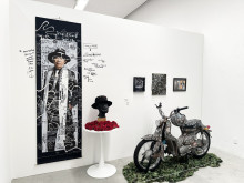 サガテレビ事業企画部の山口稜さんは「佐賀を初めて訪れたという木梨さん本人と妻の安田成美さんが開催前に会場に入り、細かく展示方法を調整されているので、佐賀だけの展示順や工夫も楽しめ、展示に合わせて木梨さん直筆のコメントも見ることができる。作品を写真撮影してもらうのはもちろん、若槻千夏さんとトークする音声ガイドを活用してもらい、何度も楽しんでほしい」と呼びかける。