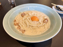 メニューは、「肉ごぼううどん」「カルボナーラうどん」「明太クリームうどん」(以上980円)、「佐賀ラータンうどん」「はまぐりうどん」(以上1,100円)など。定番の「肉うどん」(850円)や「ごぼううどん」(750円)、「釜玉うどん」(600円)、「釜揚げうどん」(550円)なども提供。「0次会を意識した」というおつまみメニューに、「じんアソーテッド酒肴」(1,400円)、「ローストビーフ」(900円)、「バーニャカウダ」(650円)、「ジンポテトサラダ」(500円)なども用意する。