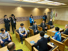 坂井英隆・佐賀市長らに佐賀市開催公式戦への意気込みを伝える、サガン鳥栖の小林智之社長ら