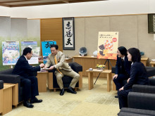 佐賀県のブランドかんきつ「にじゅうまる」を使った新商品「オランジェット扇切り 佐賀にじゅうまる」の販売を1月16日に始めた日本果汁(京都市下京区)の河野聡社長らが同20日、山口祥義佐賀県知事を訪問した。