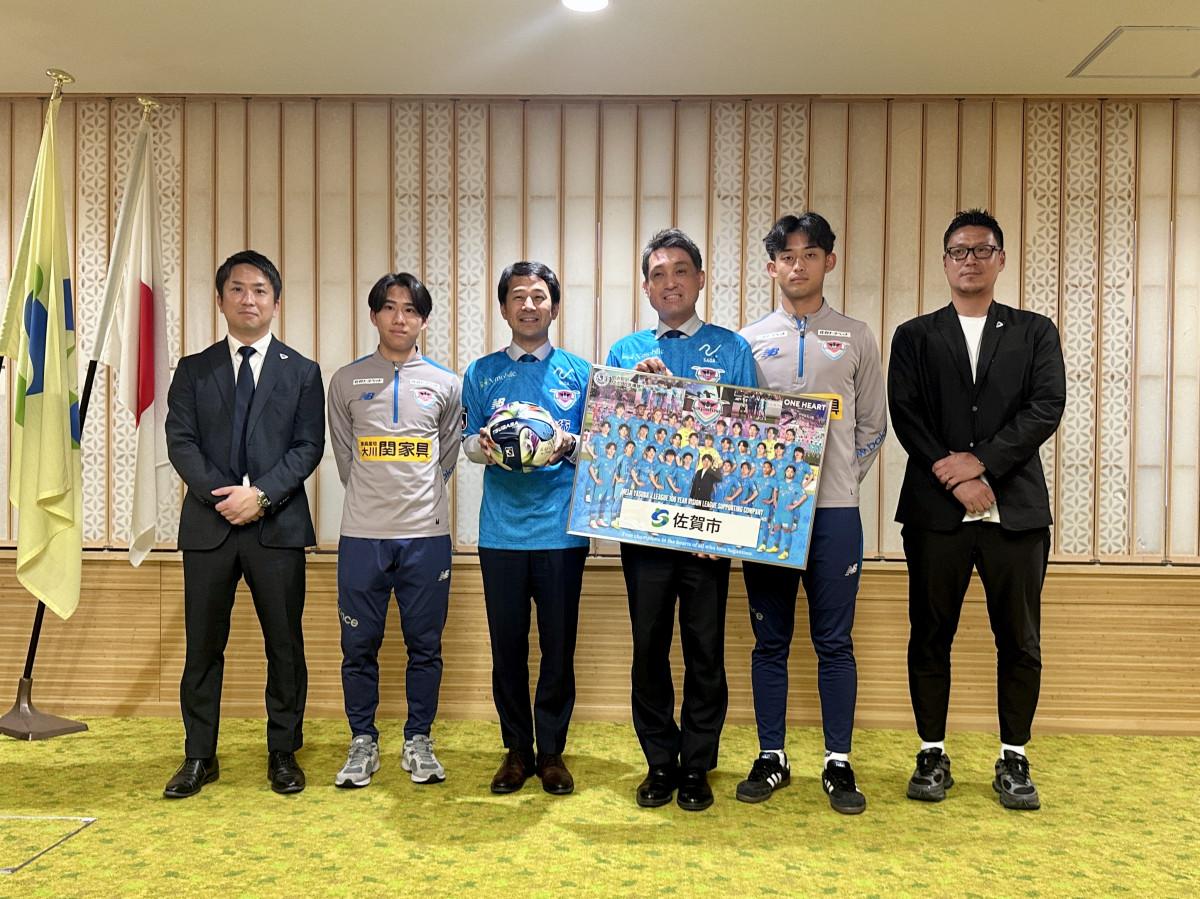 坂井英隆・佐賀市長らに佐賀市開催公式戦への意気込みを伝える、サガン鳥栖の小林智之社長ら