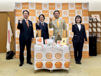 佐賀県のブランドかんきつ「にじゅうまる」を使った新商品「オランジェット扇切り 佐賀にじゅうまる」の販売を1月16日に始めた日本果汁(京都市下京区)の河野聡社長らが同20日、山口祥義佐賀県知事を訪問した。