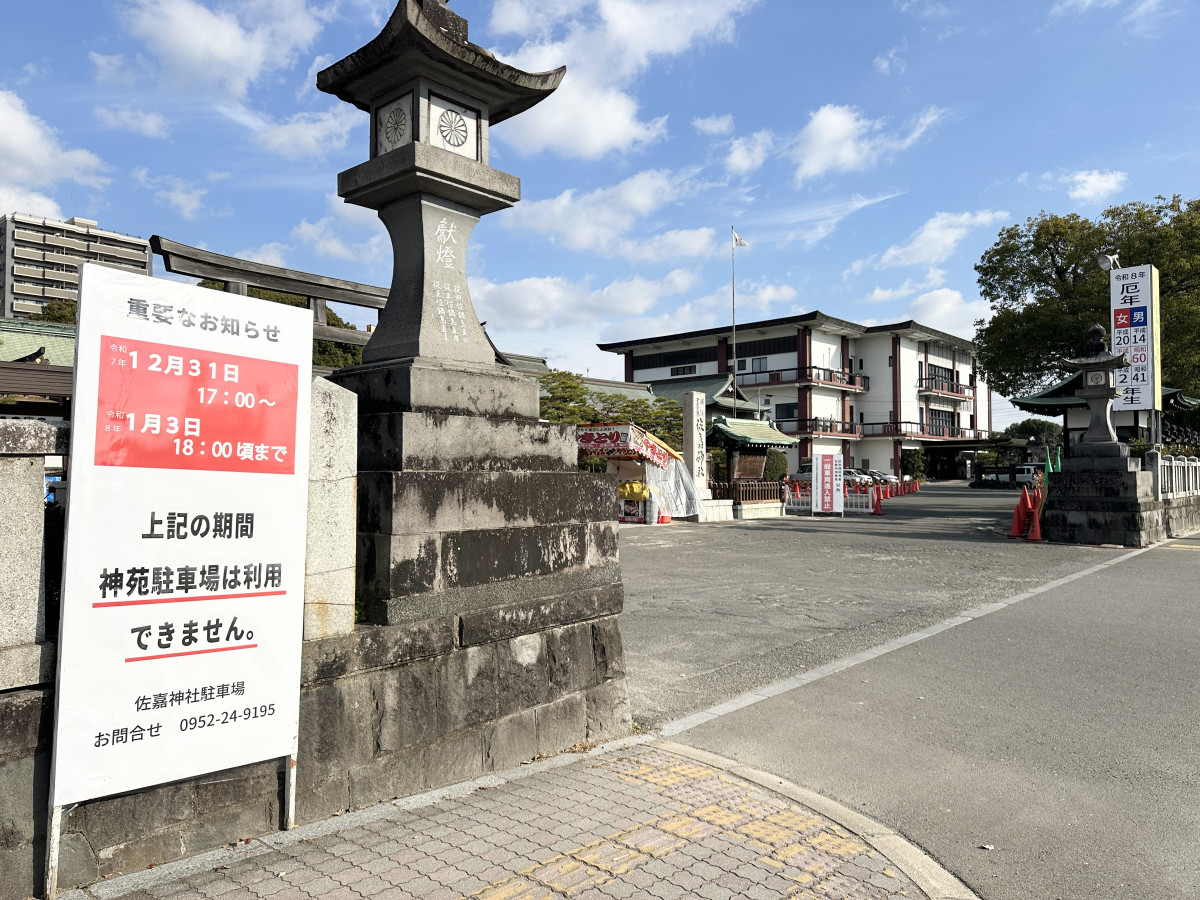 佐嘉神社初詣に伴う交通規制を今年度から変更し、規制期間中、佐嘉神社西側の「神苑(境内)駐車場」を閉鎖する。