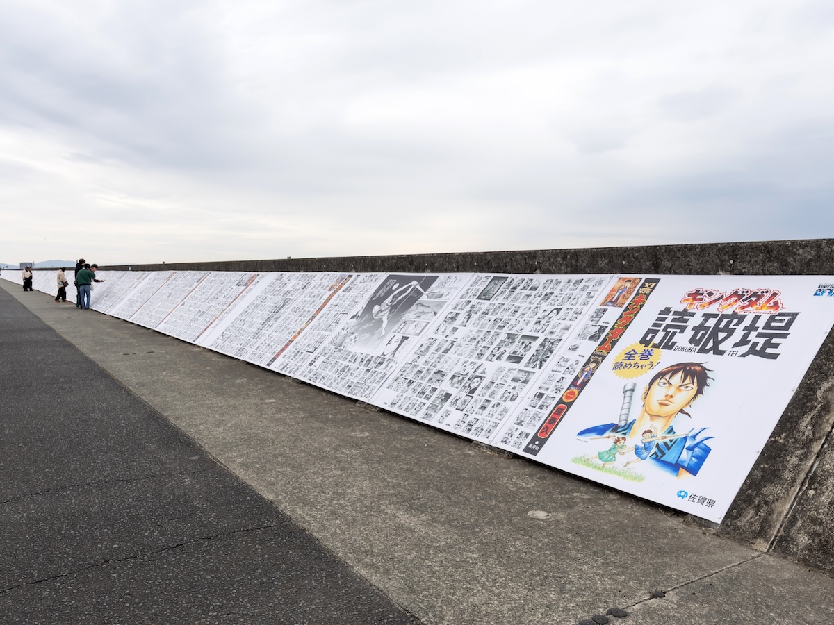 「東よか干潟」の防波堤に掲出された、漫画「キングダム」のコミックス77巻までの全ページを一気読みができる全長300メートル超の「読破堤」