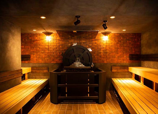 小さな噴水が常に立ち上がる幻想的な空間。30分に一度の「潮吹きタイム」では、噴水の水がストーブにかかりロウリュとなり、さらに風と水がお客様に向かって吹き上がる“鯨の潮吹きショー”を体験できます。