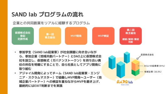 「SAND lab(サンドラボ)」は、DAOプラットフォームとweb3技術を組み合わせ、実際の起業を経験できる日本初の起業家教育プログラムです。(※自社調べ 2025年11月時点 日本国内における「DAO上で仮想的に起業体験を行う起業家育成プログラム」として)