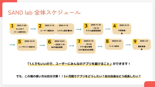 第一弾として、2025年11月より3ヶ月間の「SAND lab 2025」プログラムを開催することを決定しました。中高生が「未来の起業家」として社会課題の解決に挑みます。