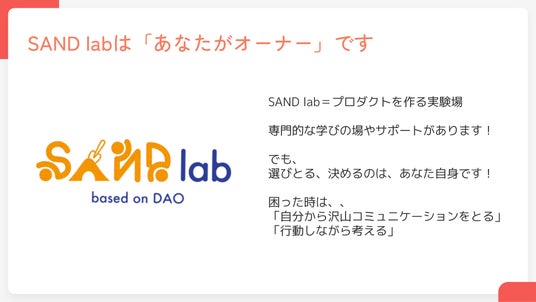 SAND labは、この理念に基づいた新しい起業家教育の形です。大人子どもの垣根を超えた共創の場として、砂場のように挑戦と創造が溢れる実験拠点を目指していきたいと思っています。