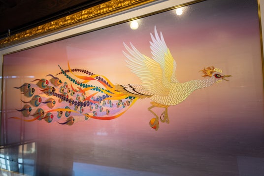 『鯤』の頭部に目を向けると、そこには色とりどりの文様が描かれ、その中には尽きることのない「いのちの循環」を思わせる唐草文様の意匠も見られます。宇宙の理に導かれていのちがめぐり、再び息づくさまを象徴していることが伺えます。