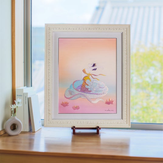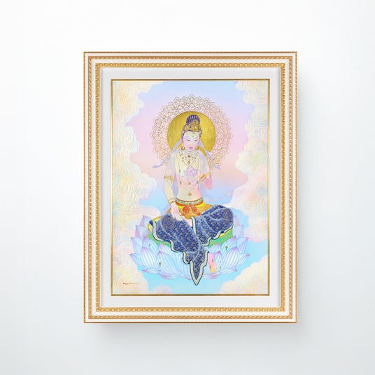 作家はチベットに伝わる観世音菩薩とターラの物語から着想を得て、虹色の光をまとう菩薩を描きだしました。その虹色は、あらゆる感情や体験を包み込み、昇華させた光彩。どのような瞬間にも光が宿り、一人ひとりが本来、輝きそのものであることを表しているような、陶彩画らしい優しい光に満ちた作品です。