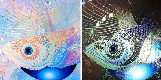 有田焼や他の焼き物とは異なり、陶彩画は草場独自の技法による色彩と、見る角度によって変化する光の表情が最大の特徴です。七色に輝く龍、柔らかなパステルの色合い、そして迫力ある豊潤な色調──それらは、通常4回ほどとされる焼成を最大15回にまで重ねることで生まれた、まさに奇跡の色といえます。