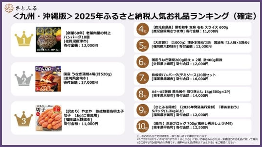 ふるさと納税ポータルサイト「さとふる」を運営する株式会社さとふる(本社:東京都中央区、代表取締役社長 兼 CEO:藤井 宏明)は、「さとふる」における<九州・沖縄版>2025年人気お礼品ランキング(確定)(※1)を発表します。