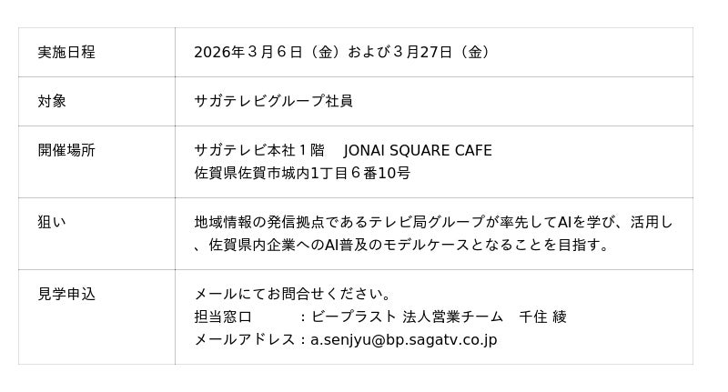 本提携の第1弾の取り組みとして、2026年3月6日(金)および3月27日(金)に、サガテレビグループ社員を対象とした「A.I.KENリスキリングキャンプ」を開催。地元メディア企業が先行してAI活用モデルを示すことで、佐賀エリアにおける企業のDX推進を加速させ、だれもがいきいきと挑戦できる新たな雇用環境の創出を目指します。